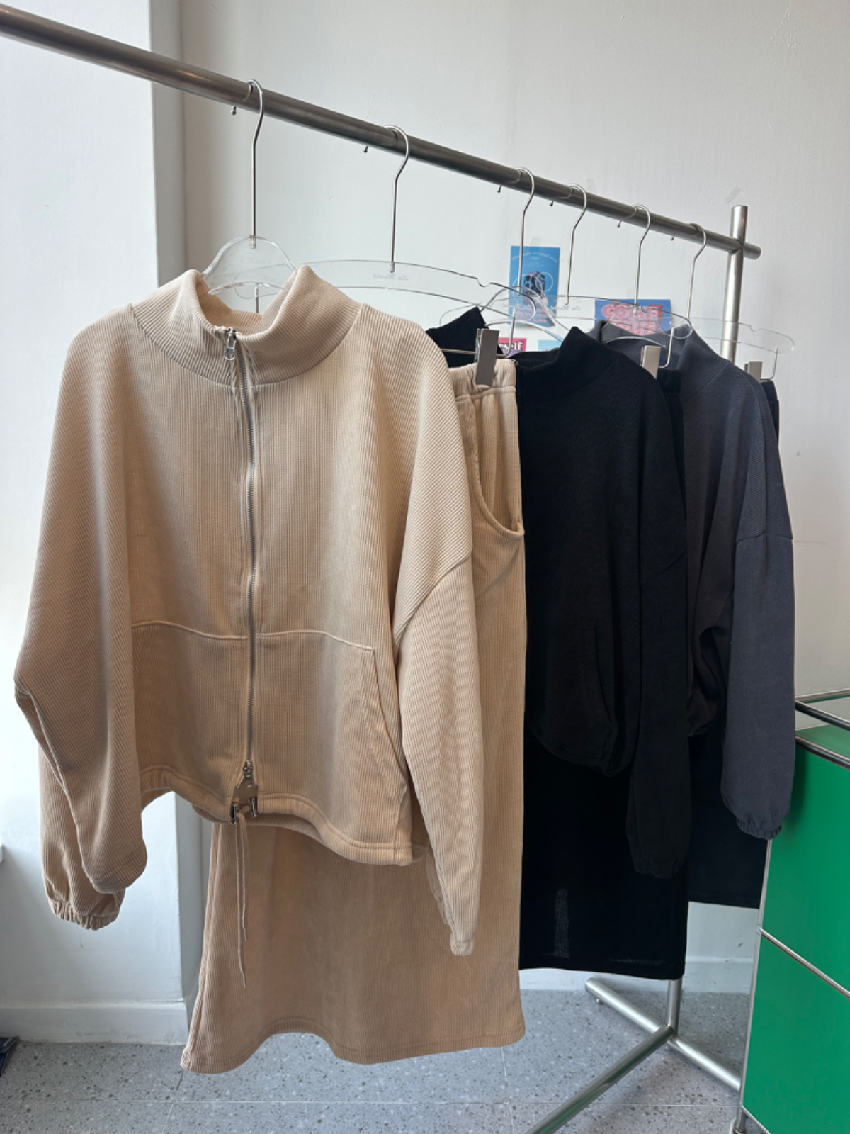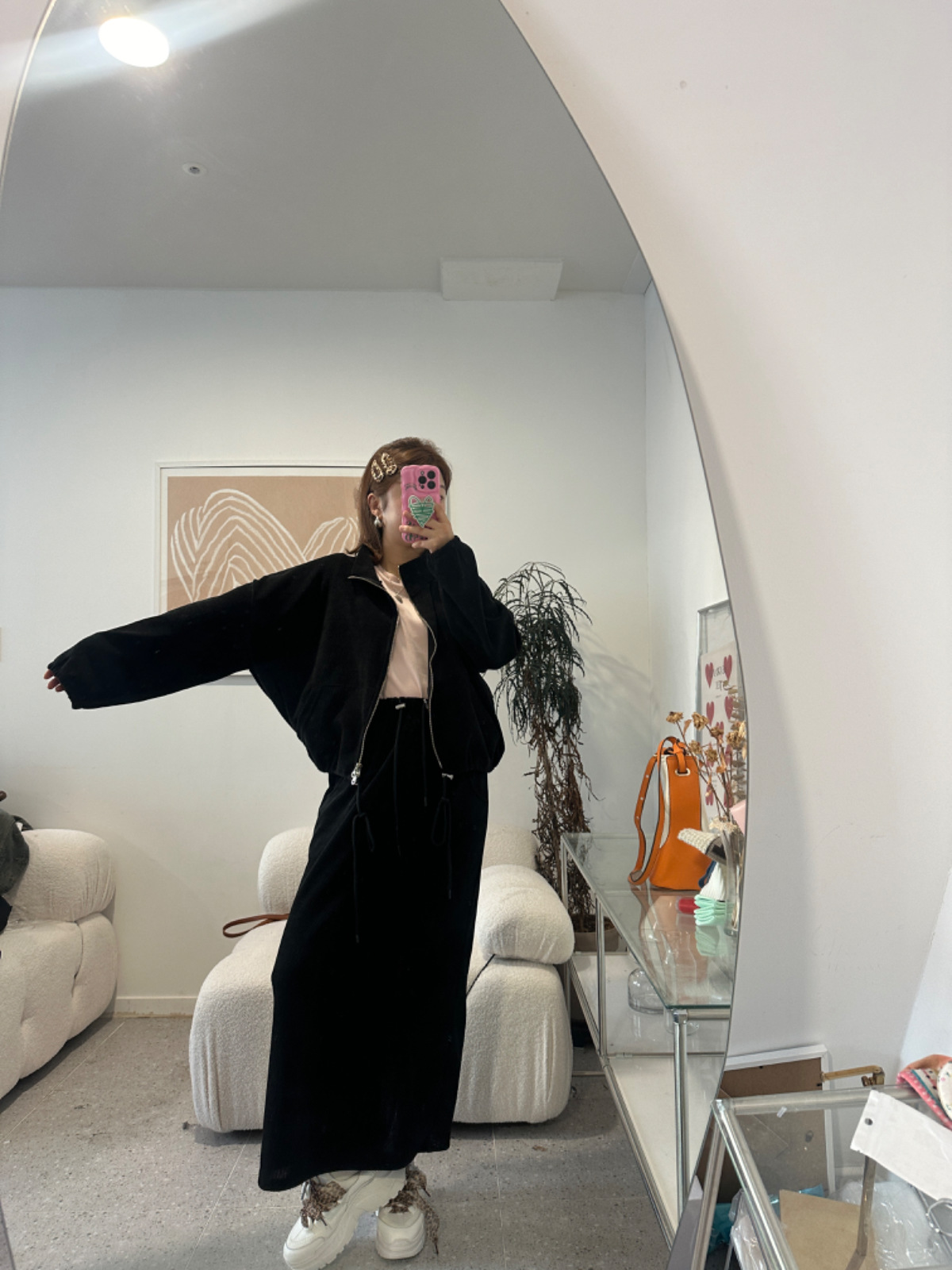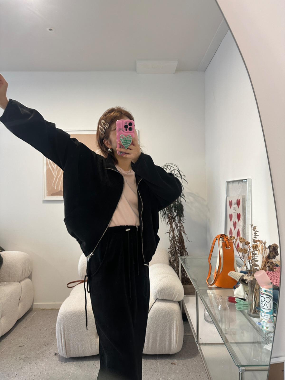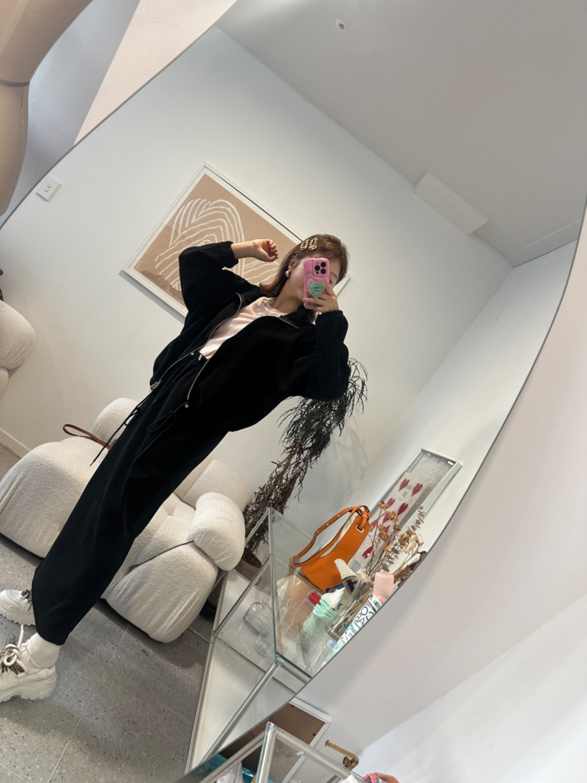 집업은 투웨이버튼 집업에 체형에 따라 아래 밑단을 잡아 입는 스타일!