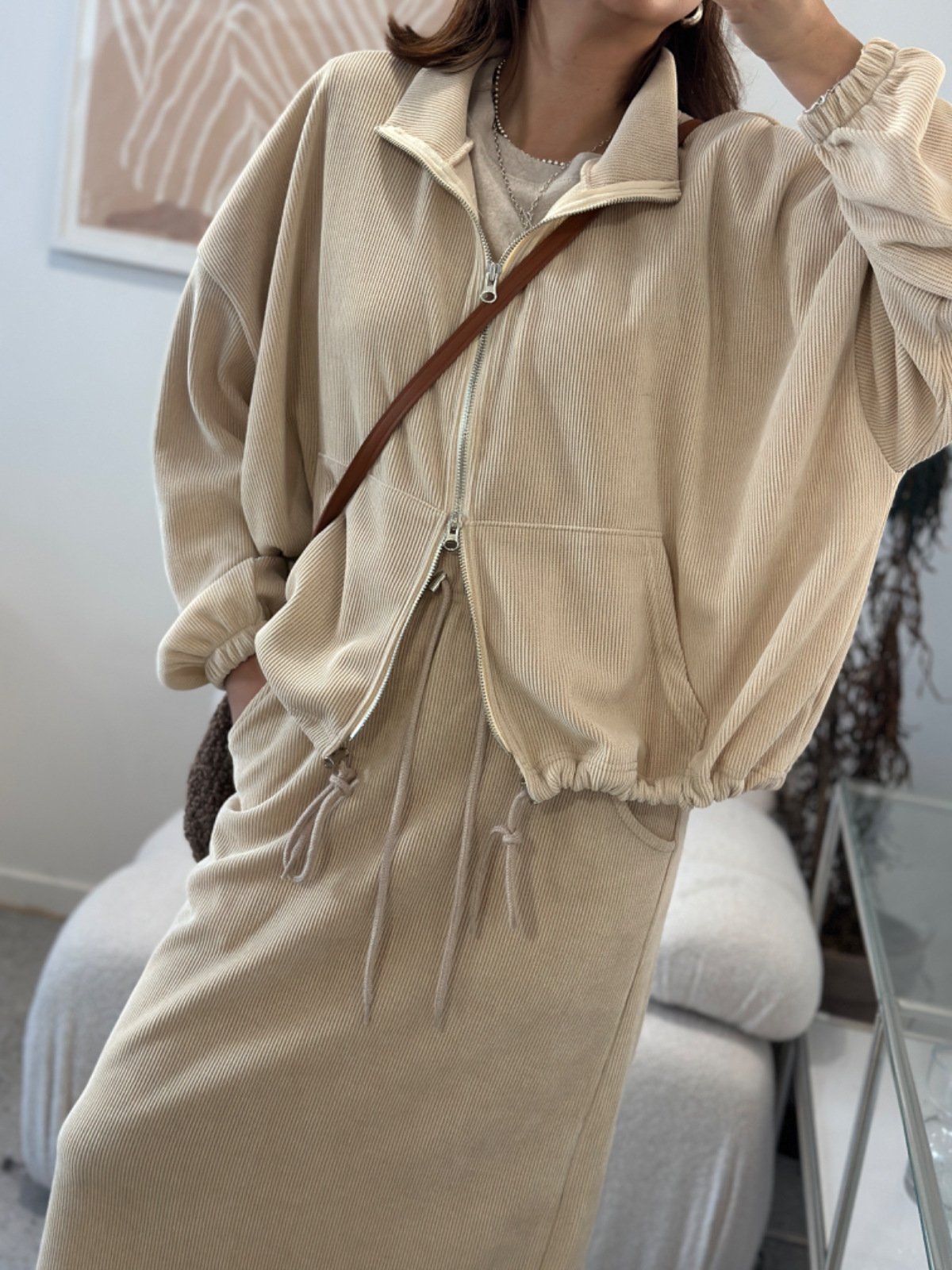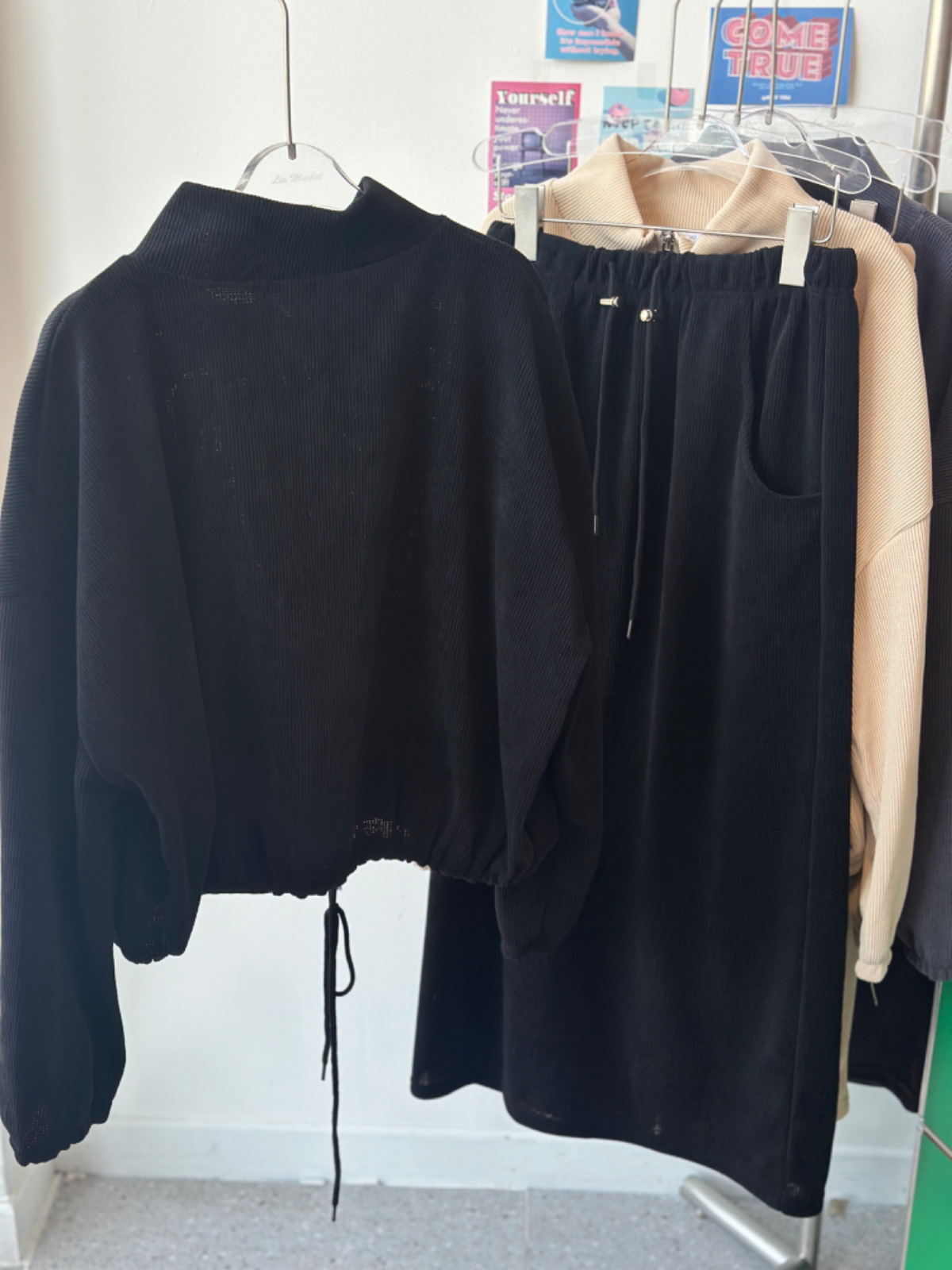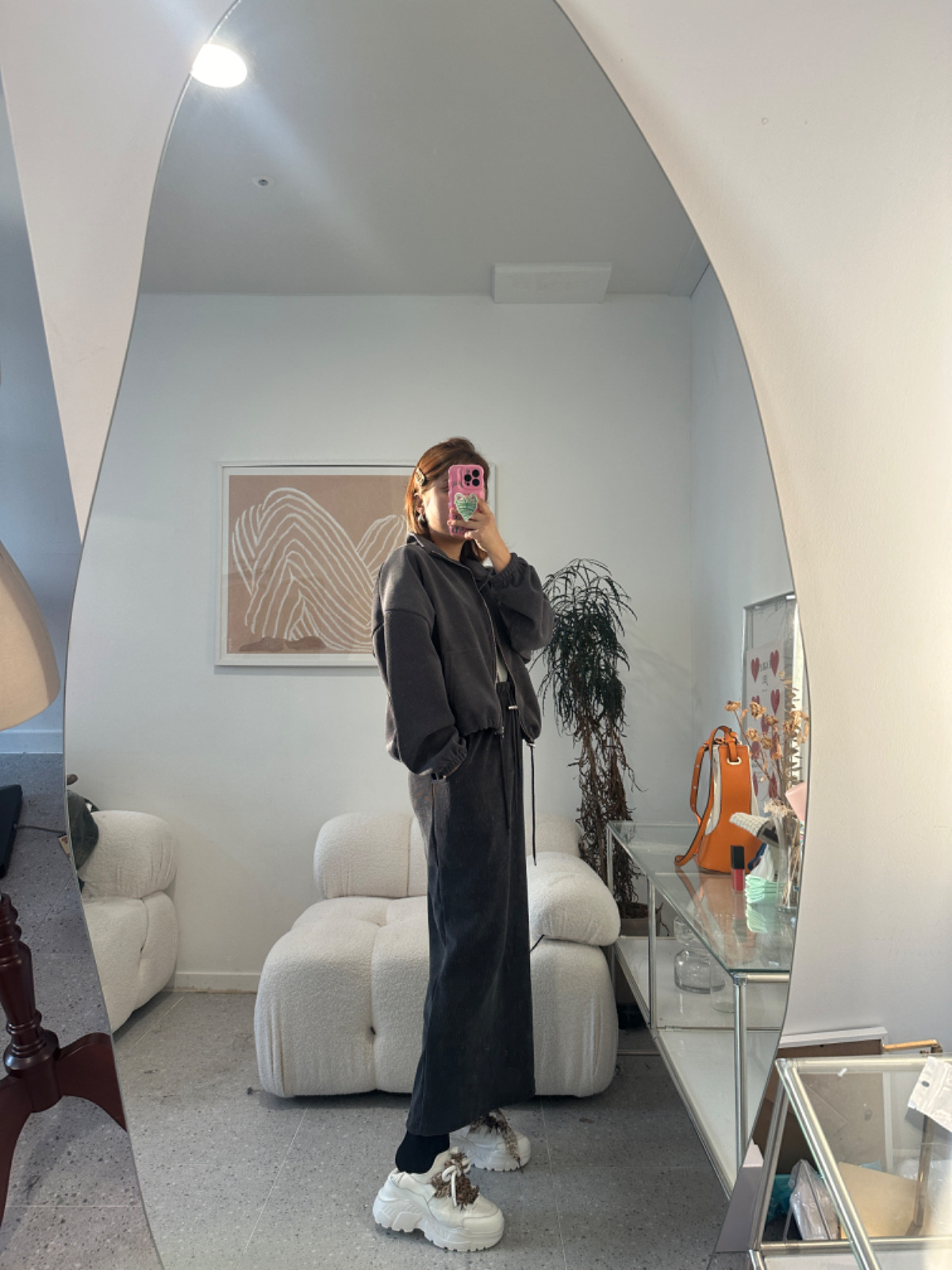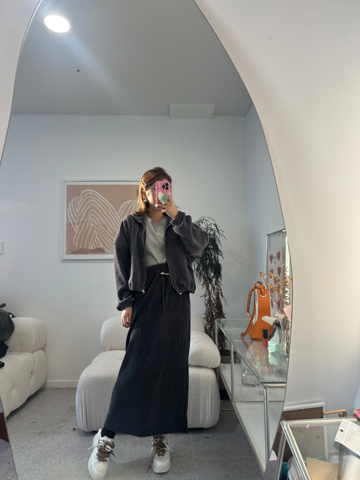 집업은 투웨이버튼 집업에 체형에 따라 아래 밑단을 잡아 입는 스타일!